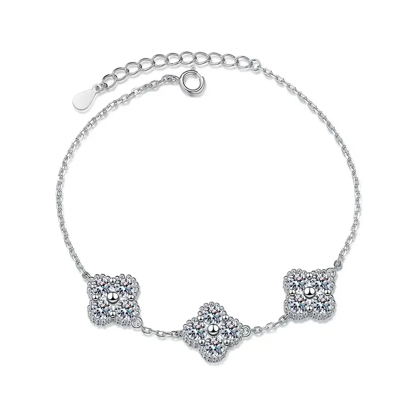 Браслет Clover Sparkle демонструє приголомшливий дизайн чотирилистої конюшини, інкрустований блискучими каменями муасаніту.